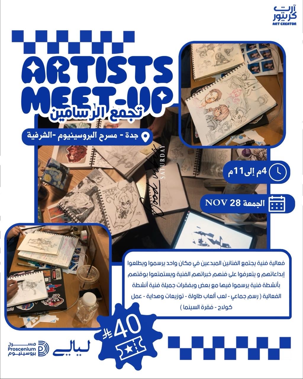فعالية فنية يجتمع الفنانين المبدعين في مكان واحد يرسموا و يطلعوا إبداعاتهم و يتعرفوا على فنهم خبراتهم الفنية و يستمتعوا بوقتهم بأنشطة فنية يرسموا فيها مع بعض و بفقرات جميلة فنية